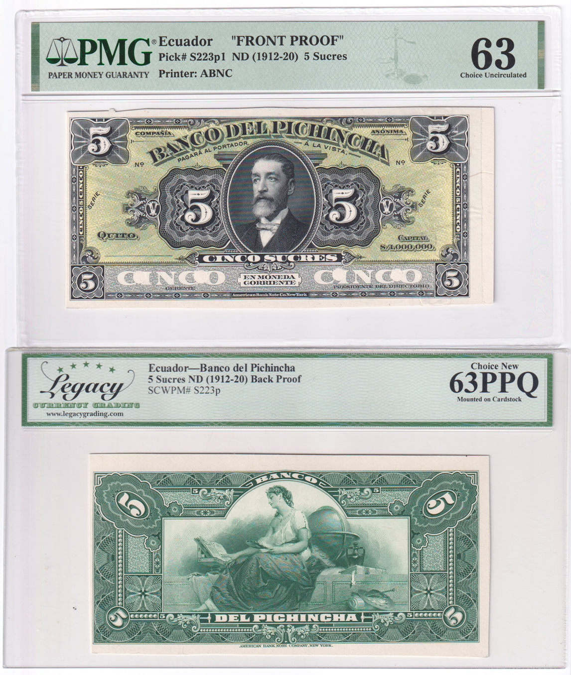 Ecuador - (1912-20) 5 sucres Front Proof PMG ChCU-63, and a (1912-20) 5 sucres Back Proof Legacy ChCU-63PPQ