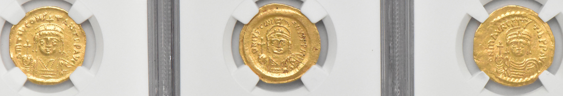 Description: NGC has attributed and graded a trio of Byzantine gold coins. Each solidus lists as: Justinian I (Ch AU, 5/2, exceptionally well centered on both sides in compliance with NGC's "5" assessment of strike), Tiberius II (MS, 5/2, clipped as annotated but not mentioned are light pinscratches on either side), and Maurice Tiberius (AUAU, 5/2, NGC mentions "clipped" which may allude to an edge scrape on the reverse far left). Three coin lot.