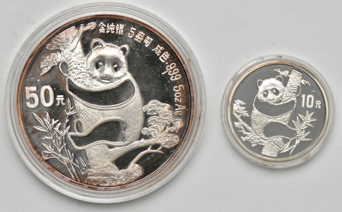 China - 1987 5oz silver Panda 50 yuan, and a 1987 1oz silver Panda 10 yuan with certificate and wooden box.