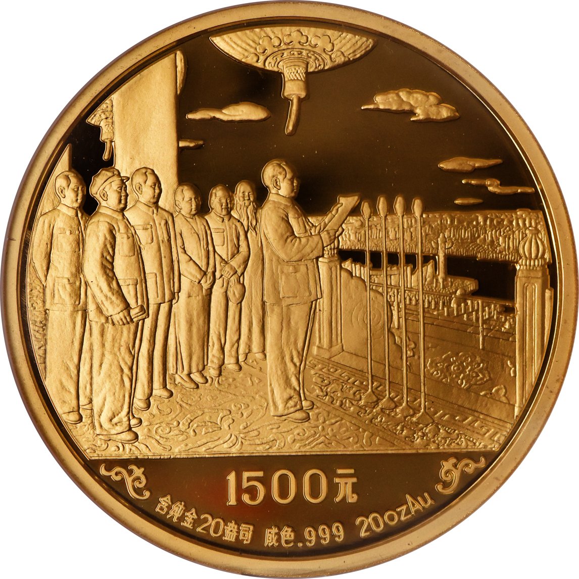 Description: Mintage of only 100 pieces, serial number 039, visible on rim. Considered particularly scarce among modern Chinese issues. Struck in 1989 to commemorate the 40th anniversary of the People's Republic of China. Mao and countrymen present a speech on obverse. Citizens celebrate below fireworks and national seal on reverse. Appears under graded, at least PF67 to cataloger. Truly and exceptional treasure of modern world issues.