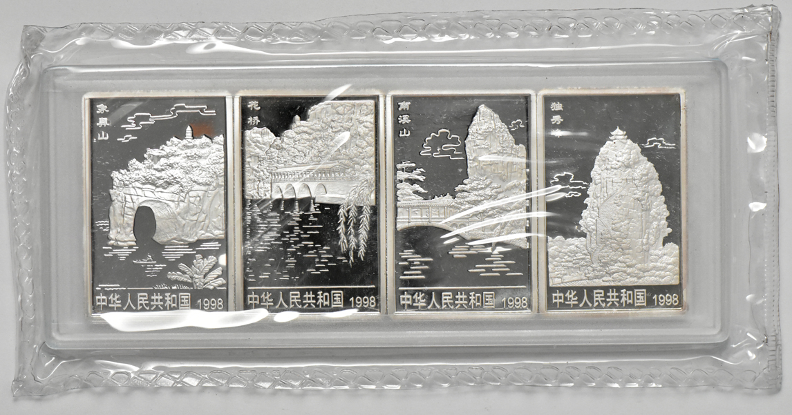 Description: Here is a very ornate and scarce run of four 1998 2oz. 20 Yuan Chinese silver rectangular coins that were release in 1998 to commemorate the Guilin’s Landscape of China. Each coin depicts a different landscape scene and were limited to a small mintage of only 18,800 each. This particular set of four is still double sealed and hosed in the original wooden box along with its matching COA. A very difficult find in this condition (ck).