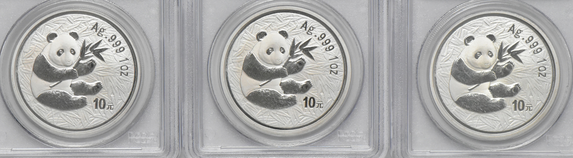 Description: Ten PCGS certified 2000 10 Yuan frosted ring 1 oz silver padas. All MS-69. Featuring sitting panda holding bamboo branch and embossed bamboo background.