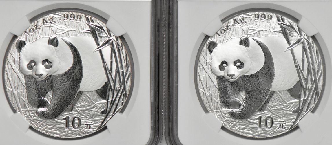 Description: 2002 remains the only repeat design year in the entirety of the silver panda series. This peculiar date has precisely the same design as the 2001 production run; a panda wading through a bamboo forest. While this non-change was not popular and eventually overturned the following year in 2003, 2002 remains more difficult than average to procure in a MS-70 grade. Presented here are four in such a designation, all NGC certified.