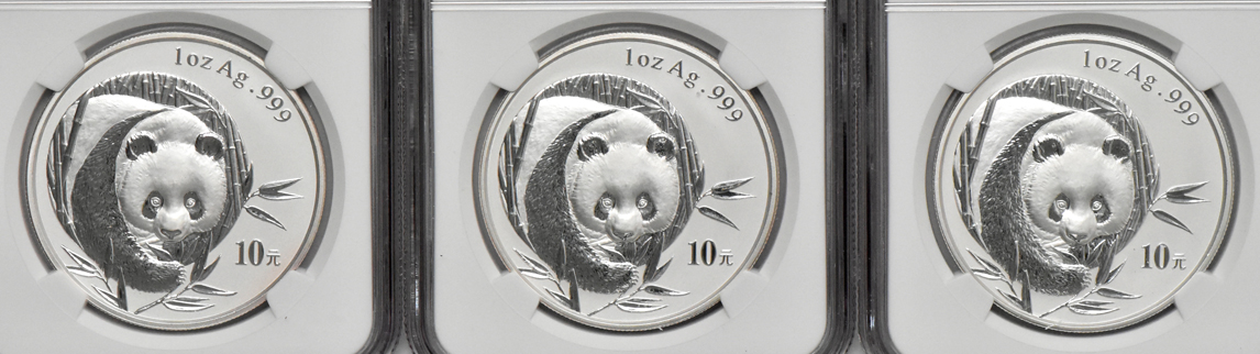Lot Title: China - Ten 2003 mirrored bamboo 1oz silver Panda 10 yuan, all NGC MS-70