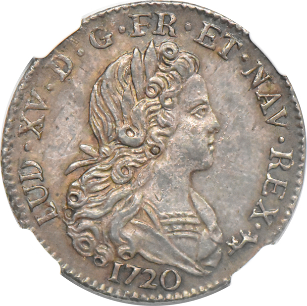 Description: Gadoury-305, John Law issue ascribed to the Louisiana Territories financier who was managing the French mints. While often found with adjustment marks, this remarkable coin shows placid smoke-grey surfaces with considerable luster and an absolute absence of offending contact marks.