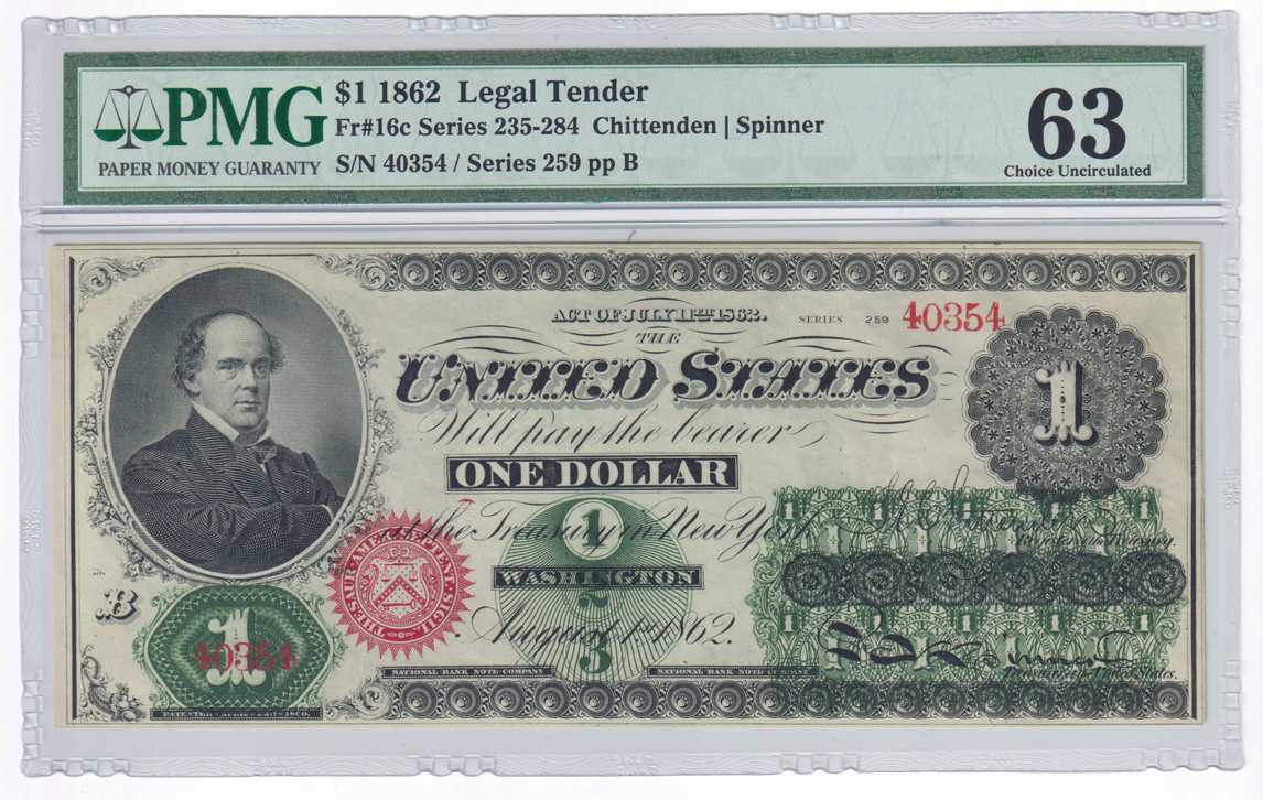 Lot Title: 1862 $1 Fr# 16c - PMG ChCU-63/pinhole
