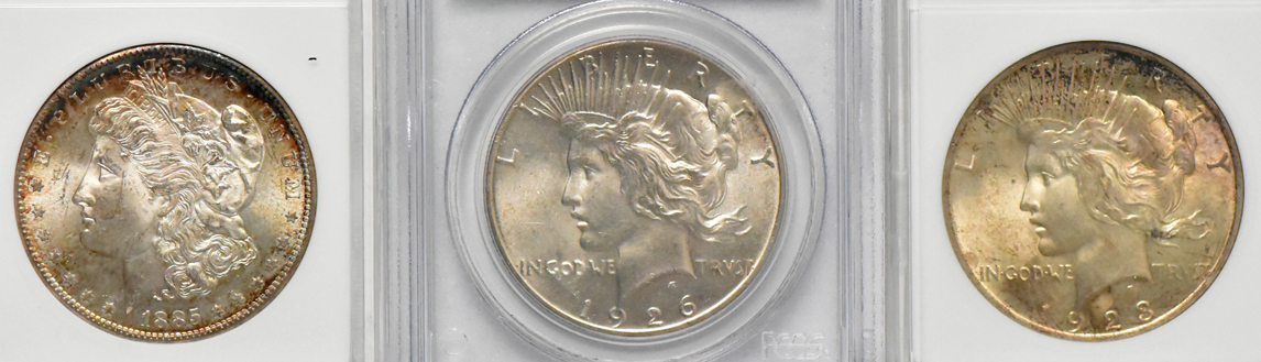 Description: Coin chaos. There is absolutely no rhyme nor reason for the assembly that makes up this eleven piece group lot of United States coins. Six of these examples are ANACS certified (soap box holders) silver dollars and includes an 1878-S Morgan MS-62, an 1885-S Ms-63, 2x 1922 Peace MS-64’s, a 1923 Peace MS-64, and a 1925 Peace MS-64. The final five pieces are described as follows: a 1950 PCGS MS-66 Roosevelt dime, a 1953 PCGS MS-65 Roosevelt dime, a 1947 NGC (fatty holder) Ms-64 Walking Liberty half-dollar, a 1926 PCGS MS-64 Peace dollar, and a 1923-S ACG “A3-65” Peace dollar (ck).