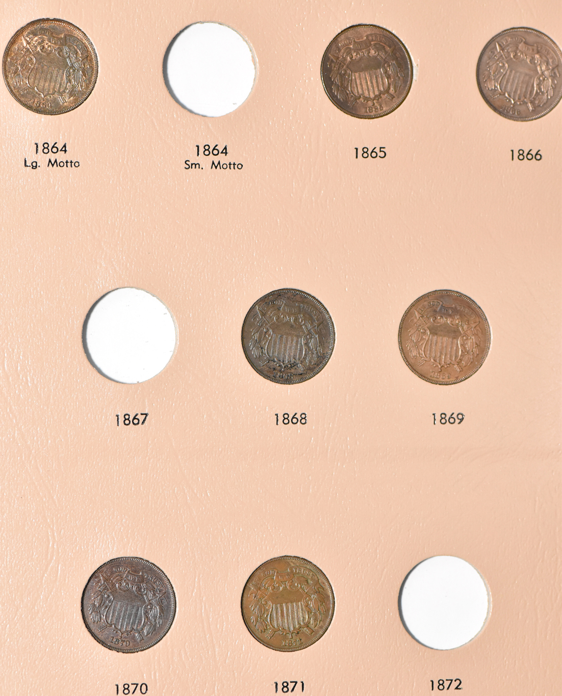 Description: There are a total of twenty examples within this Dansco album lot of Two Cent and Three Cent nickel issues. Seven of the present members are Two Cent issues and includes an 1864 Large Motto (BU, rev cleaned), an 1865 (AU), an 1866 (XF, cleaned), an 1868 (XF), an 1869 (AU), an 1870 (AU, rev cleaned), and an 1871 (XF). The remaining thirteen issues are all Three Cent nickels and includes an 1867 (XF), an 1868 (XF), an 1869 (XF), an 1873 Closed 3 (XF+), an 1873 Open 3 (VF++), an 1875 (XF, light clean), an 1876 (XF), an 1879 (XF, cleaned), an 1880 (VF, damaged), an 1881 (XF+), an 1882 (VF), an 1888 (XF), and an 1889 (XF+) (ck).