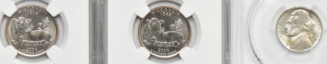 Description: There is a total of five pieces within this entirely NGC and PCGS certified variety pack of United States issues that cover a wide spectrum of types. The three NGC examples include a 1922-D Weak D AU-50BN Lincoln cent, and 2x MS-66 Wisconsin Extra Leaf Statehood quarters. PCGS has certified the final two examples which is an 1895-O AG-03 Barber dime and a 1943-P MS-65 DDO Jefferson nickel. Wacky but intriguing (ck).