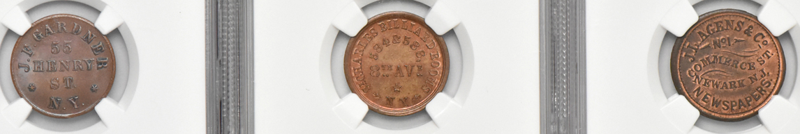 Description: Here is a sensational sixsome of store card tokens that have all been NGC certified and includes the following issues: an (1861-65) Albany, NY MS-66 F-10D-1a New York Central Railroad, an (1861-65) MS-64BN NY F-95A-2A Braun & Schellworth’s, an (1861-65) MS-63RB NJ F-555A-5a S. Tanenbaum Collection Fluid Plate, an (1861-65) MS-63RB NY F-630BT-1a S. Tanenbaum Collection Ex. Richard Rossa, an 1863 MS-65BN New York, NY F-630AA-1a J.F. Gardener, and an 1864 AU-50BN Belmont, NY F-77A-2a Langdon’s Hardware. Very impressive variety withing this handsome grouping (ck).