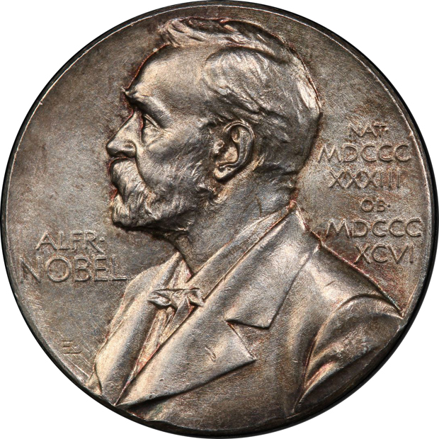 Description: Nobel Physiology ("medicine") silver medal with no date, a plain edge and measuring 27mm. Superior relief is a hallmarks of these popular Nobel medals, this coin overall showing glittering pewter character with some interesting sky-blue toning accents lurking deep within some design recesses.