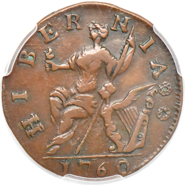 Description: Z 14-L, N-11, P below bust. Actually, there are 2 Ps below the bust as this scarce die-marriage features the letter strongly overpunched, as is "H" on the dated side. That in turn implies a coin better centered than is typical for the type. These were struck in Ireland but found heavy traffic in colonial America alongside a variety of British tokens. The portrait side shows a traces of coppery red while typical brown patina layers over the date side.