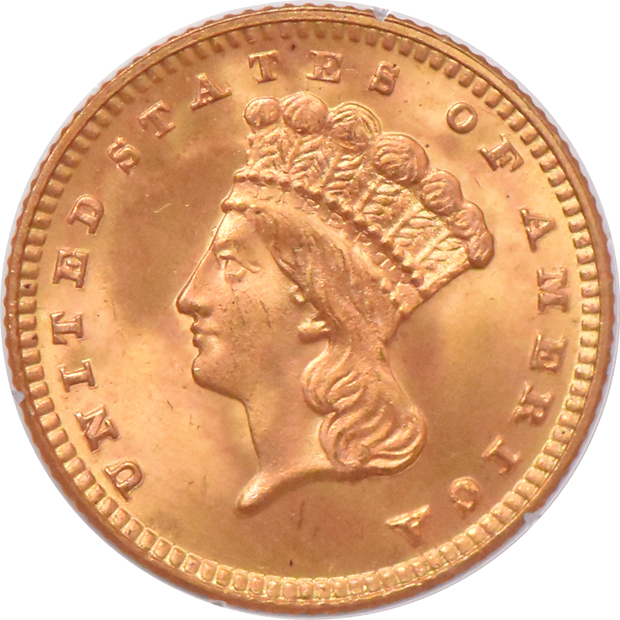 Description: Light carrot-orange tints the upper relief portions of both central designs. Exceptionally well struck and a vibrant example from the end of the run for the type-3 gold dollar.