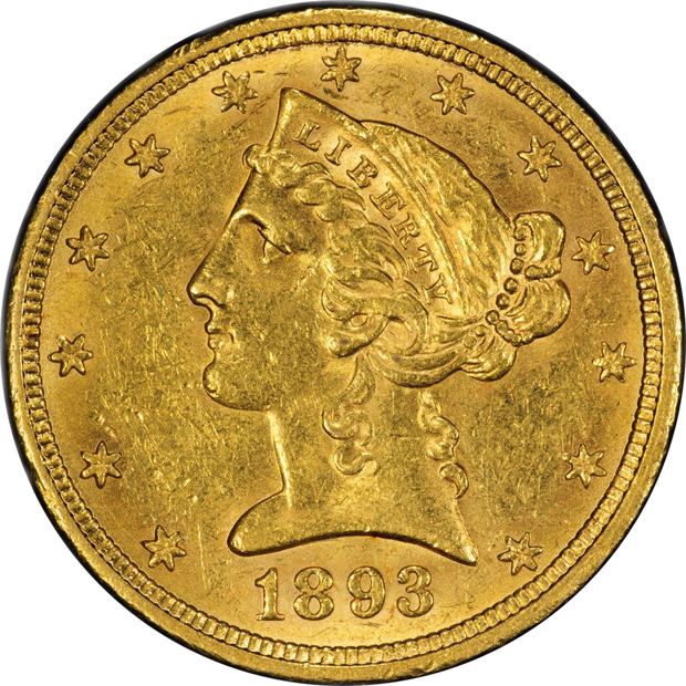 Description: Mintage of only 110,000 pieces leads to a relatively scarce New Orleans entry today. No doubt, this five has seen some wear as a collection of fairly numerous tiny abrasions pepper both sides, yet the consistently yellow-gold surface manages to preserve considerable cartwheel effect.