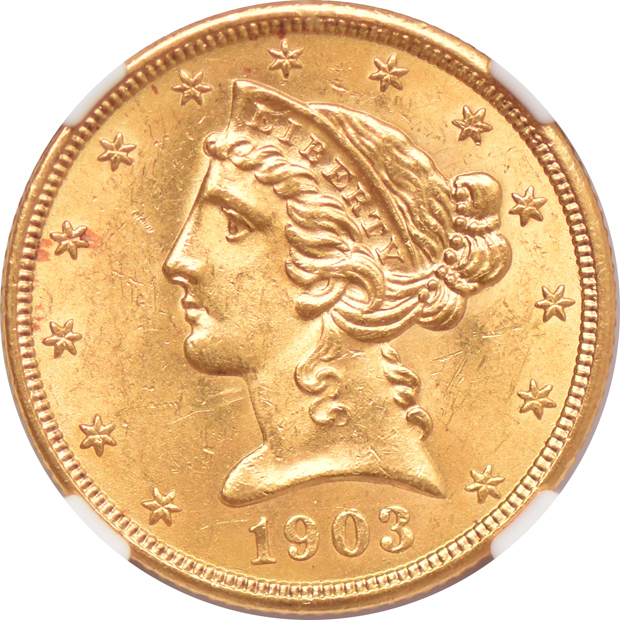 Description: Radiant and blazing yellow despite a slightly deficient strike. Tiny copper spots show at the fourth star.