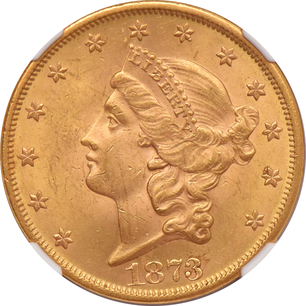 Description: Open 3, the scarcer of two logotypes. Delightful satin texture endows the entire surface and cannot contain glorious cartwheel zinging from both sides. Despite a bold die crack above MERI, the dies were able to bring up marvelous detailing on both sides.