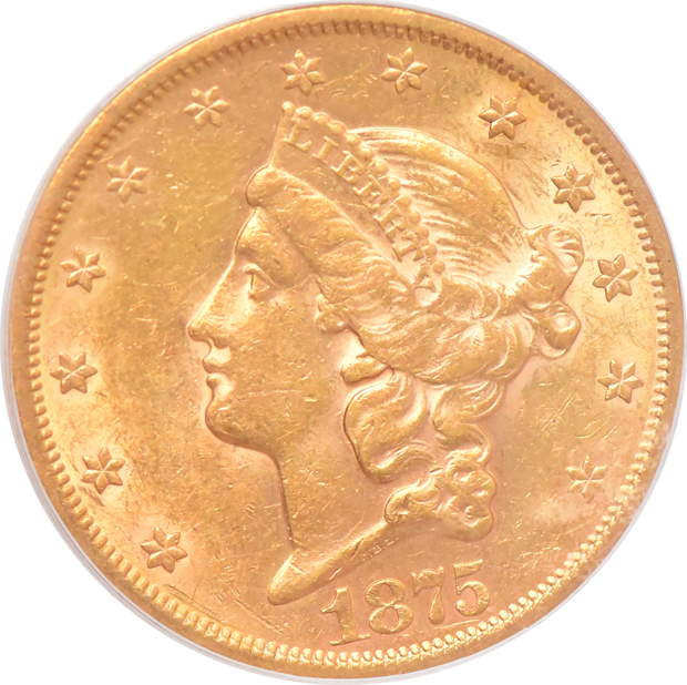 Description: Seldom available in one lot for one bid, a pair of 1870s double-eagles. Included are: 1875-S (amber highlights areas where light finger friction defines the grade) and 1876 (taken off of a cracked reverse die and showing suspicious hazy residue across the entire obverse and portions of the reverse). Two coin lot.