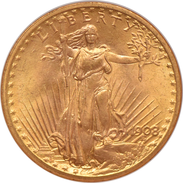 Description: Delightfully original and showing some tangerine over the lemon-gold surface. A few linear abrasions gather near and across Liberty's neck -- ouch!