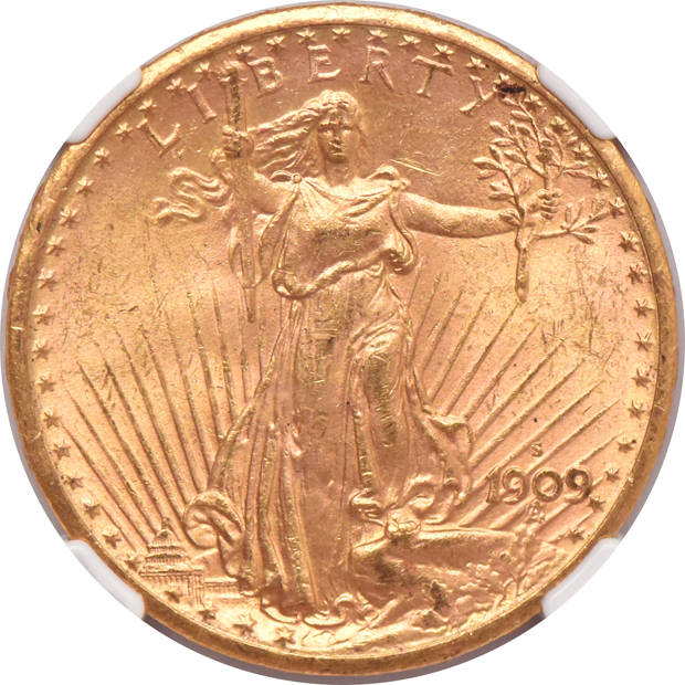 Description: A hoard discovered in the mid-1980s greatly elevated the supply of choice examples, but 1909-S remains much more elusive than the many common date Saints. This also appears to be the optimal grade, MS-63 representing the peak grade population for both grading services. Attractive, rolling satin luster steals the show, but this example does have a noticeable nick above the elbow.