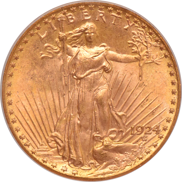 Description: Use of later dies to strike this common date Saint helps explain slight orange peel effect seen throughout. A lovely golden example with vibrant, if not flashy luster.