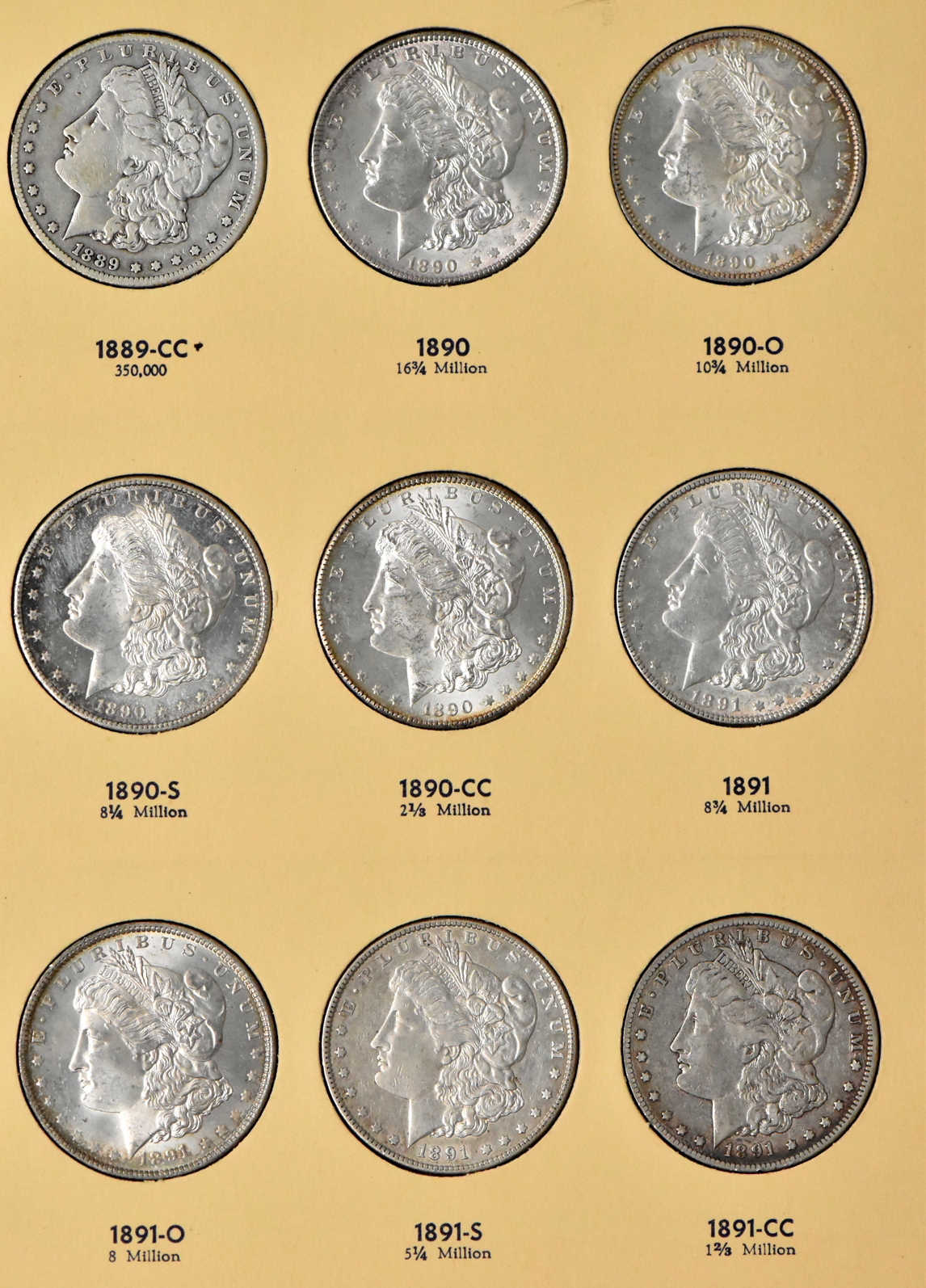 Description: Every void has been filled from 1887 through 1897 within this thirty-six coin run of Morgan silver dollars that are housed in a Library of Coins album. Included in this particular album collection are the following issues: an 1887 (BU), an 1887-O (AU++), an 1888-S (AU+), an 1889-O (BU), an 1889-S (AU), an 1889-CC (VF, cleaned), an 1890 (BU), an 1890-O (BU++), an 1890-S (CHBU PL), an 1890-CC (BU++), an 1891-O (BU+), an 1891-CC (VF+), an 1892 (AU++), an 1892-O (CHBU++), an 1892-S (VF), an 1892-CC (VF+), an 1893 (XF, cleaned), an 1893-O (F, cleaned), an 1893-S (GD+, cleaned), an 1893-CC (GD), an 1894 (VF, cleaned), an 1895-O (VG, reverse scratches), another 1895-O (F, cleaned), an 1895-S (VF), an 1896-O (BU), and an 1897 (CHBU) (ck).