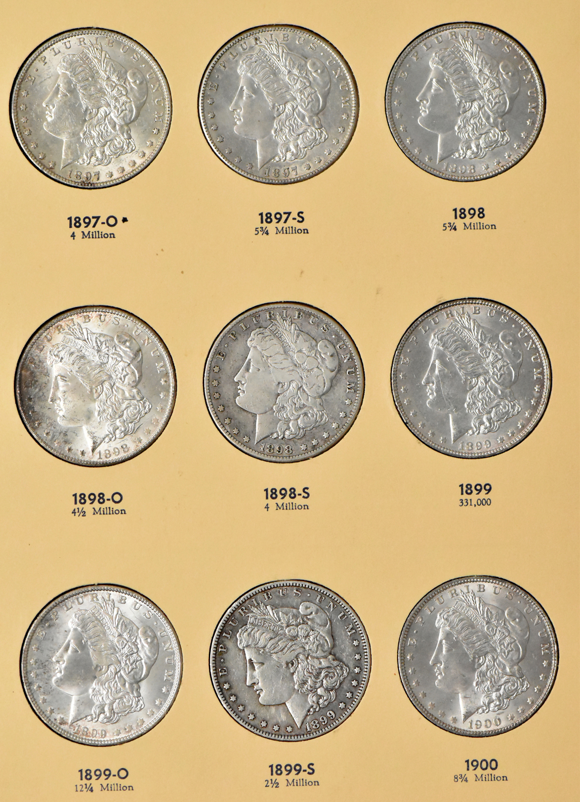 Description: There is a total of twenty-seven Morgan silver dollars within a Library of Coins album that spans from 1897 through 1921 and includes the following examples: an 1897-O (AU+), an 1897-S (XF+), an 1898 (BU), an 1898-) (BU+), an 1899 (BU+), an 1899-O (BU++), a 1900 (BU++), a 1900-O (BU), a 1901 (VF, cleaned), a 1901-O (BU+), a 1902 (BU), a 1902-O (BU++), a 1902-S (XF+), a 1903 (BU++), a 1903-O (BU++), a 1903-S (VF), a 1904-O (BU++), a 1904-S (F+), and 2xs 1921’s (BU) (ck).