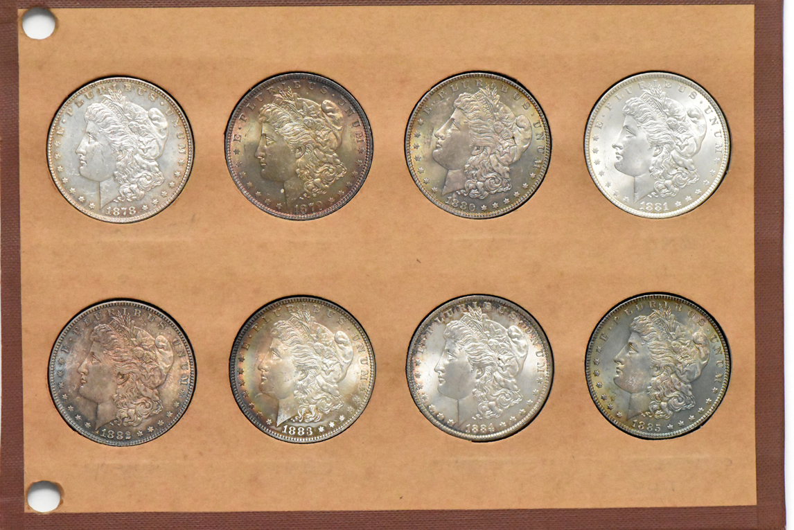 "City of Brotherly Love" Collection. ONLY Philadelphia minted Morgan silver dollars reside within this magnificent album collection that consists of an entire “date set” (less an 1895 issue) run along with three additional raw examples and two bonus certified examples as well. Beautiful toning and blast white examples contrast each other wonderfully throughout the raw portion of this massive group lot and includes the following issues: an 1878 7TF Reverse of ’78 (BU, semi-PL), an 1879 (MS-63+, toned), an 1880 (MS-63+, toned), an 1881 (Gem BU), an 1882 (MS-63+, toned), an 1883 (Gem BU, toned), an 1884 (MS-63), an 1885 (MS-64+, toned), an 1886 (MS-63+, target toning), an 1887 (MS-64+, semi-PL toned), an 1888 (BU, toned), an 1889 (CHBU), an 1890 (BU, toned), an 1891 (CHBU, semi-PL), an 1892 (MS-63), an 1893 (MS-62), an 1894 (AU+), an 1896 (MS-63+, toned), an 1897 (MS-63+, toned), an 1898 (CHBU, semi-PL), an 1899 (BU, toned), a 1900 (Gem BU), a 1901 (AU++, PL), a 1902 (MS-63), a 1903 (BU), a 1904 (MS-64+), a 1921 (MS-64, toned), an 1878 7TF Reverse of ’79 (BU, peripheral toning), an 1878 8TF (CHBU), an 1878 7TF Reverse of ’78 (BU). The two certified examples include an 1878 7/8TF Strong VAM-37 7/4 MS-62 CAC and an 1887/6 ANACS VAM-2 MS-61 (soapbox). There is something about beautiful raw Morgan silver dollars in a Wayte Raymond Inc. album that just simply can not be beat (ck)! |