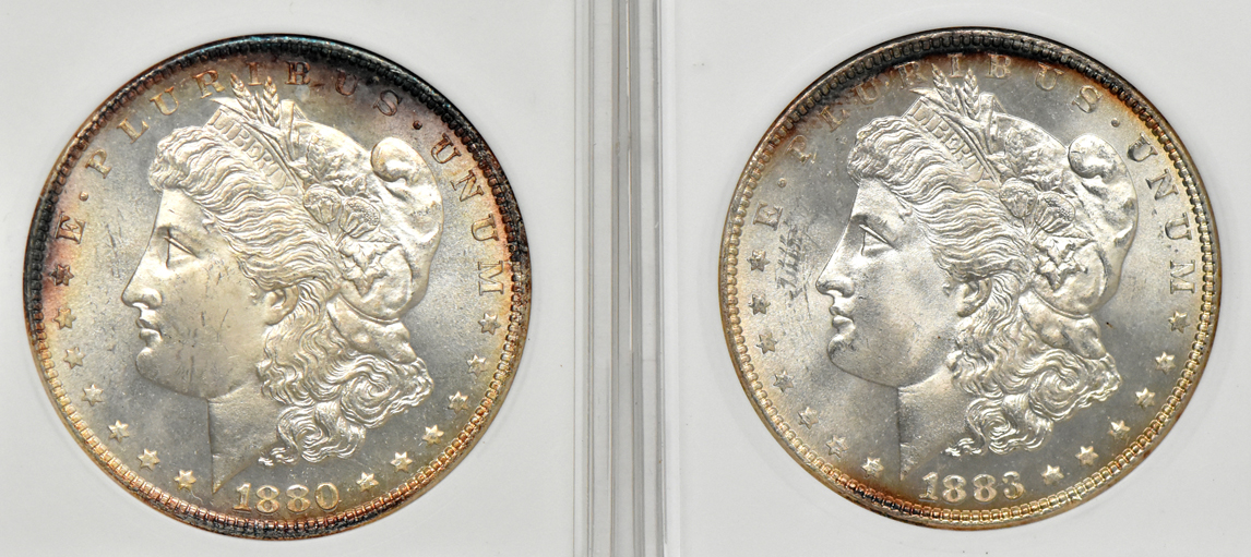 Description: A sensational six pack of Morgan silver dollars fills this eye catching group lot with nothing but “soap box” style ANACS issues. Included in this run is an 1880 MS-64, an 1883 MS-65, an 1884 MS-65, an 1887-O MS-63, an 1890-S MS-64, and a 1902-O MS-64. Predominantly white fields are noticed, but each example offers its own twist on attractive tones that cling to the peripheries. Conservative grades to say the least (ck).