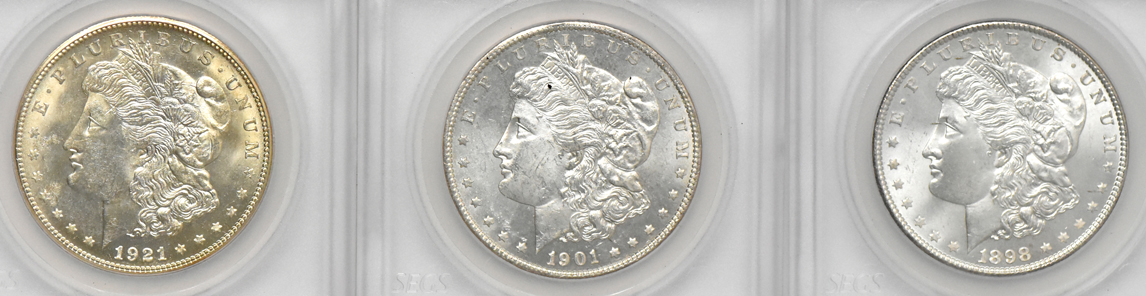 Lot Title: Six SEGS certified Morgan silver dollars with peculiarities