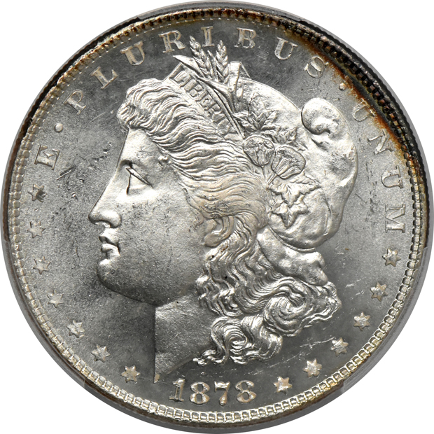 Description: First is MS-64, sparkling with vivid, near-perfect details and a sudden spark of bag-induced color at the obverse upper right. Accompanying is MS-64+, one of the minor doubled-die obverses for 1878 and this coin just sparkling with silken watery luster. Two coin lot.