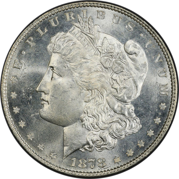Description: Doubled-die reverse. A little bit of cameo effect on both sides adds a bit of drama to this opulent blast-white dollar. No marks at all can be found on Liberty's cheek but trivial luster grazes in the obverse left field may have denied a full very-gem grade.