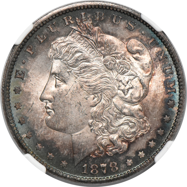Description: Blatantly an original album representative, an impressive ring of deeply saturated turquoise color surrounds the rose-grey obverse while the reverse sees intermingling of the same colors with pronounced orange overtones. An extremely well struck inaugural Carson City issue.