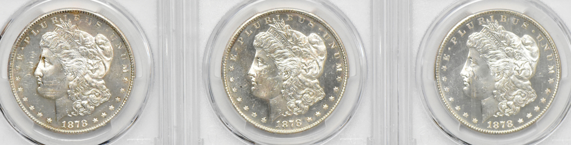 Description: It is almost impossible to distinguish any tangible differences between these six 1878-S Morgan silver dollars that have all been certified by PCGS. Included in this jaw dropping sixsome is a MS-62PL, 3x MS-63’s, and 2x MS-64’s. While only the lone MS-62 was given the PL designation, it is seemingly impossible to understand why all of the other issues were not awarded the same designation (ck)?