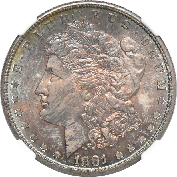 Description: Silver-plum, turquoise-orange and chartreuse hues all over both sides propel this superb silver dollar to its lofty grade level. That said, persistent examination cannot find the slightest disturbance on the cheek and only trifling tiny abrasions rest in front of and beneath the chin. A spectacular example of a date commonly available in nearly all grades.
