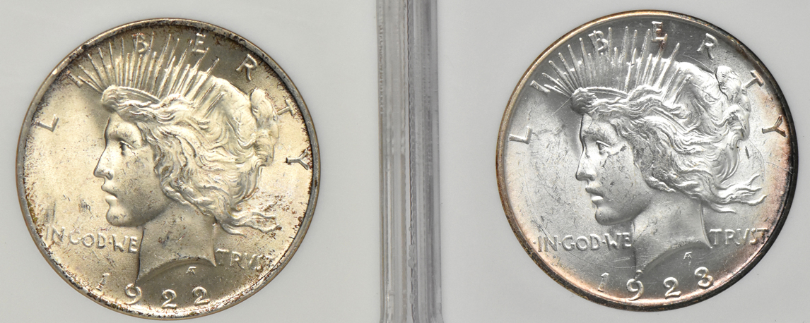 Description: Steeply struck surfaces and swirling luster are readily noticed when looking at this foursome of NGC certified Peace silver dollars. Included in this dazzling display is a 1922 MS-64, a 1923-D MS-64, a 1923-S MS62, and a 1925 MS-65. This lot could possibly make a great jumping off point for anyone thinking of putting together a complete run of certified Peace dollars (ck)?