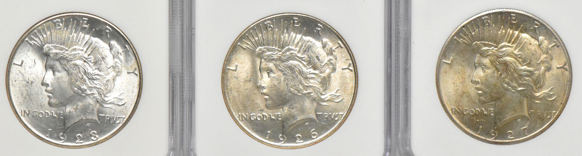 Description: Two bright and one modestly toned example of the Peace dollar series could be a cornerstone for a pleasing collection. Included are: 1923-S (exceptionally lustrous and aluminum-white), 1926-S (just the faintest whisper of yellowish patina over inadequately struck details), and 1927 (noticeable champagne-yellow toning over bold luster). Three coin lot.