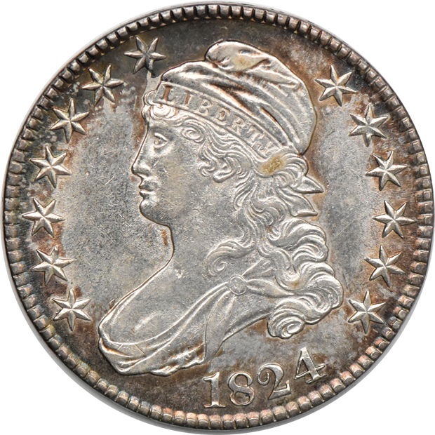 Description: Overton-115. Cataloger's grade: [AU-50], augmented by some nicer toning that descends inward from all rims. Granted, the surface is not perfectly original as it shows evidence of a very faint wipe but little evidence remains as color slowly overtakes the surface.
