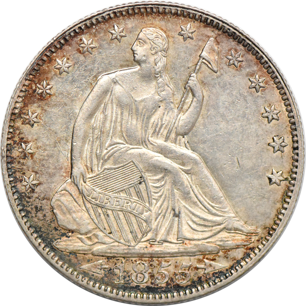 Description: Cataloger's grade: [ex-PCGS AU-55], the grade accurately reflecting very light, fleeting obverse hairlines introduced during circulation. Due to some time stored in an album, russet-orange and indigo colors drape inward from the rim in various places.