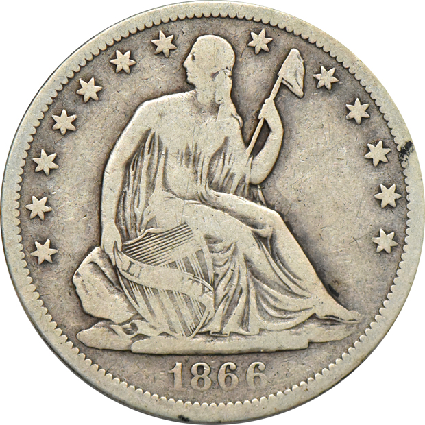 Description: Much better half-dollars comprise this pairing. Included are: 1866-S no motto (cataloger's grade [VG/PVC residue/rim ding], with perfect sharpness for the grade but for visible greenish reside and a chip out of the reverse lower right edge), and 1873-CC (cataloger's grade [AG-3] and about as ideal as a coin gets at the grade, with the bonus allure of the Carson City mint). Two coin lot.