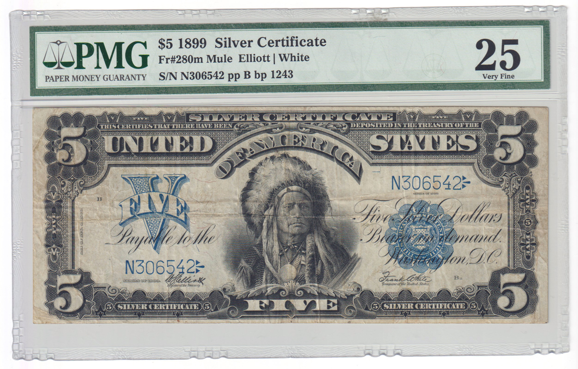 Lot Title: 1899 $5 Chief Fr# 280m Mule John Burke Back Plate #1243- PMG VF-25