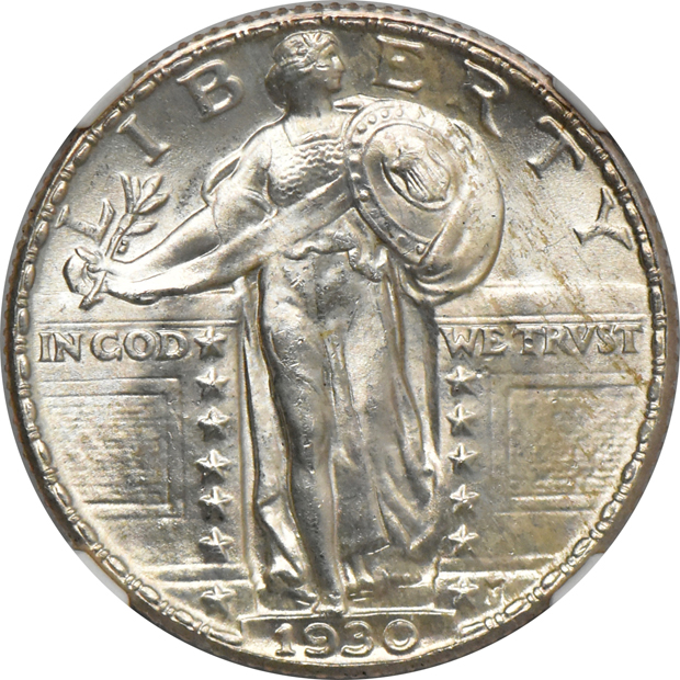 Description: Full head all by itself does not adequately convey how overall well struck this late Philadelphia issue actually is, as Liberty's hair and face erupt with very fine delineation and even the shield -- always a trouble spot for 1930 -- features demonstrably better-than-average definition through the rivets. A tiny ding on the tiny cheek, and three small reeding nicks upper most at the eagle's left (observed) wing constrain the grade.