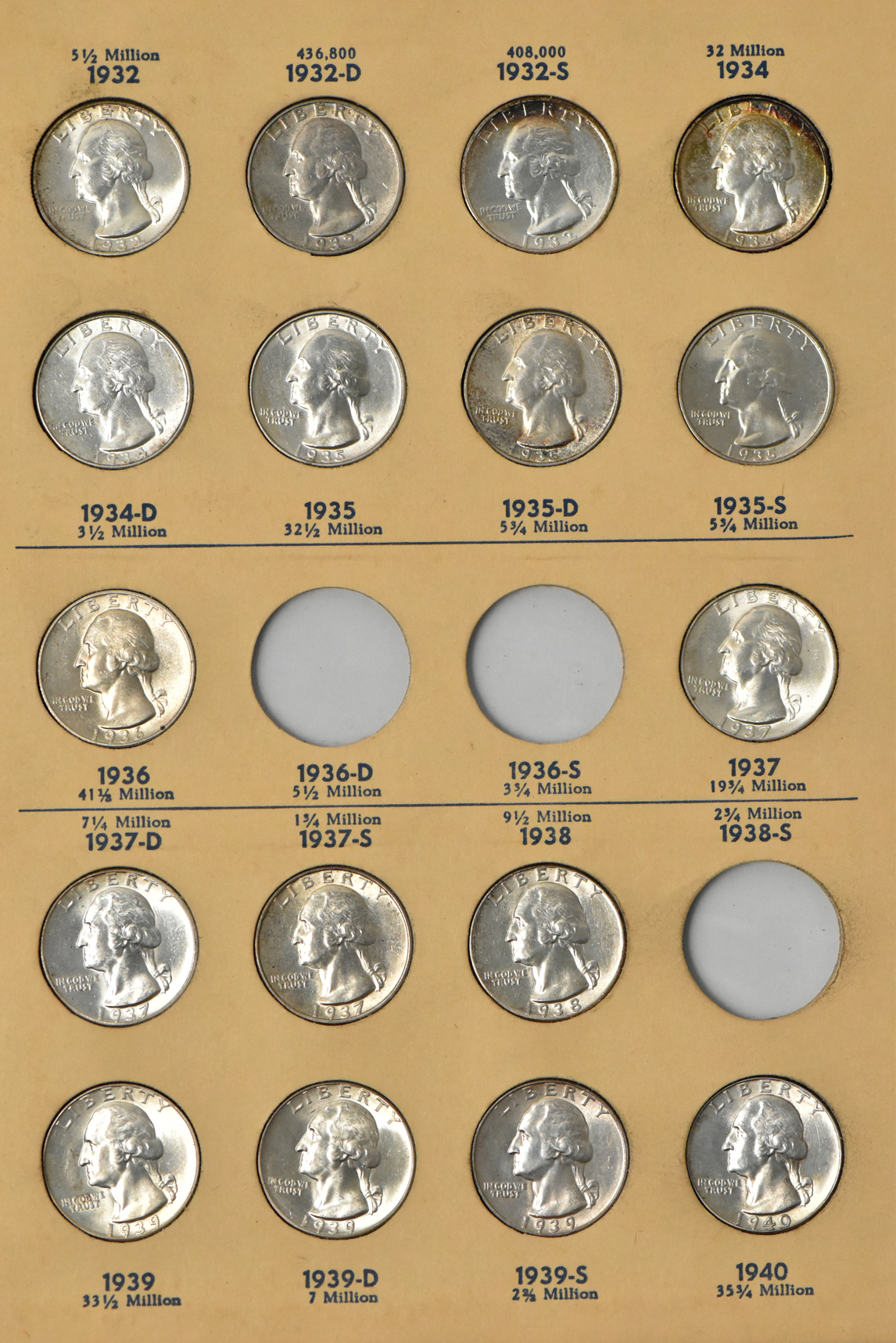 Description: Only two issues are missing (1936-D and 1936-S) from this nearly complete collection of Washington quarters that stretch from 1932 through 1962. All of these examples tightly range in grade from Almost Uncirculated through Gem Brilliant Uncirculated and are carefully housed in a Library of Coins album. Included in this dazzling display is a 1932 (BU+), a 1932-D (AU), a 1932-S (AU, cleaned), a 1934 (AU+), a 1934-D (AU+), a 1935-D (AU++), a 1936 (AU+), a 1937 (BU+), a 1937-D (BU), a 1937-S (AU++), a 1939-D (BU++), a 1939-S (BU), and a 1940-D (BU++). The overwhelming majority of the remaining collection is found to be in the upper reaches of Choice Uncirculated condition (ck).