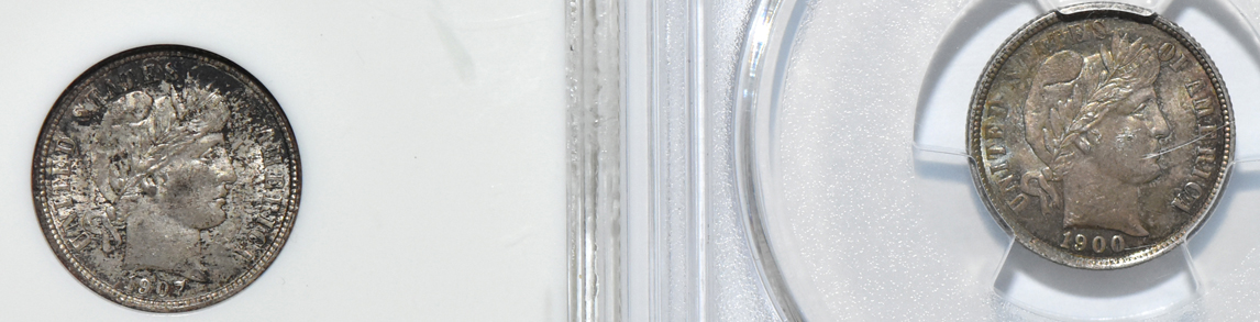 Description: A pair of Barber dimes have both been certified as grading MS-62. First is 1900 (smoke-grey patina over excellent luster but limited by a smidge of cabinet friction on the cheek). Accompanying is 1907 (extremely original denim-blue and indigo-grey on the obverse, the whole seemingly choice but showing slightly subdued luster). Two coin lot.