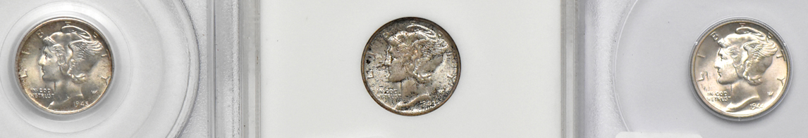 Description: What an incredible run of NGC, PCGS, and ANACS certified Mercury dimes that cover every date and mintmark from 1941 through 1945. Included in this dazzling display are the following examples: a 1941 PCGS MS-66FB, a 1941-D PCGS MS-65FB, a 1941-S NGC MS-66FB (fatty), a 1942 PCGS MS-66FB, a 1942-D NGC MS-65FB, a 1942-S ANACS MS-65FB (soapbox), a 1943 NGC MS-66FB, a 1943-D NGC MS-65FB, a 1943-S NGC MS-66FB (fatty), a 1944 PCGS MS-65FB (rattler), a 1944-D NGC MS-65FB (fatty), a 1944-S NGC MS-66FB (fatty), a 1945 ANACS MS-66 (soapbox), a 1945-D NGC MS-65FB, a 1945-S PCGS MS-65FB, and a 1945-S Micro S ANACS MS-65 (soapbox) (ck).
