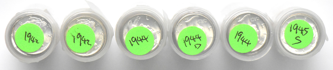 Description: Super solid! A total of six rolls of fifty Mercury dimes fills this massive three-hundred coin lot and includes 2x 1942’s, 2x 1944’s, a 1944-D, and a 1945-S. Each of these rolls appears to be truly Gem Uncirculated lending credibility to their originality. Wonderful opportunity for a bulk submission to the choice grading service of the new owner (ck).