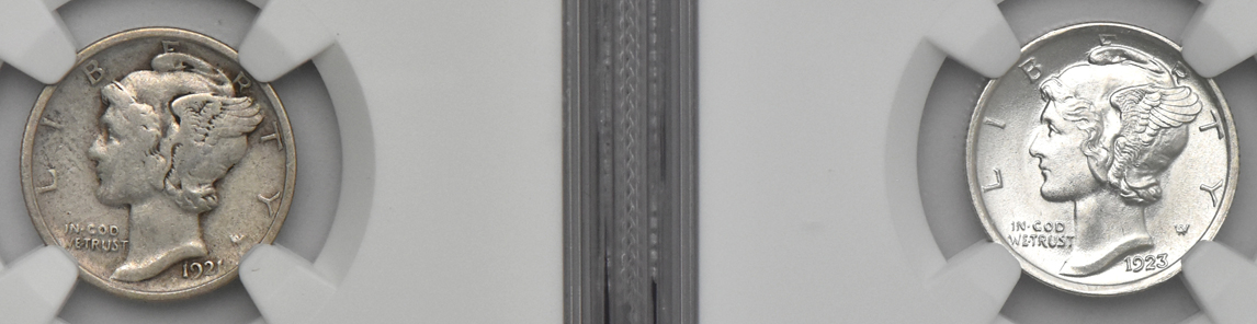 Description: Blast white surfaces with radiating luster appropriately describes three of the four members within this foursome of NGC certified Mercury dimes. Included in this four-coin group lot is a 1921 VF-35, a 1923 MS-66, a 1943-D MS-67FB, and a 1945-S MS-67FB. Gorgeous examples of this truly iconic design (ck).