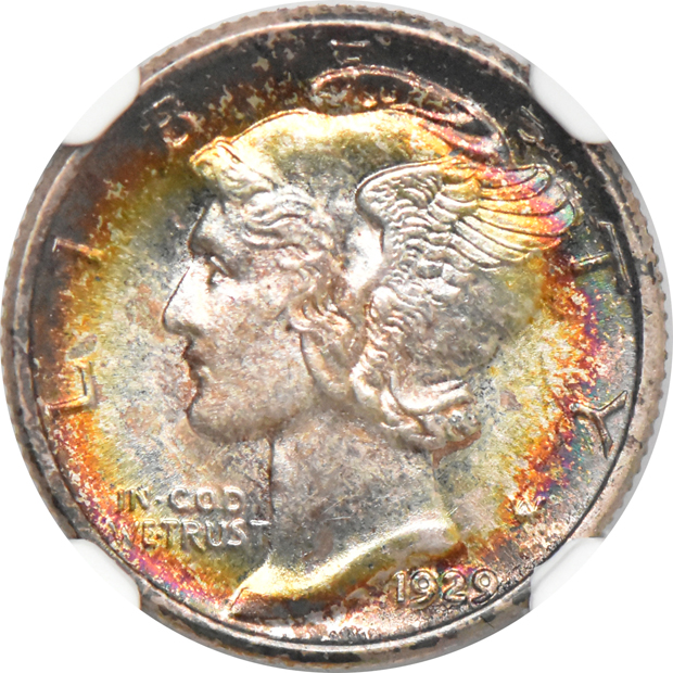 Description: Perhaps NGC blew it because stellar aesthetics like this deserves recognition. Fragile cyan rim toning surrounds pastel ruby-grey on the reverse, but the obverse serves up gorgeous album toning that detonates eye-appeal. Shimmering bands of ocean-blue, plum-chartreuse and crimson-gold spill inward from the rims and push lovely pastel toning upon the portrait.