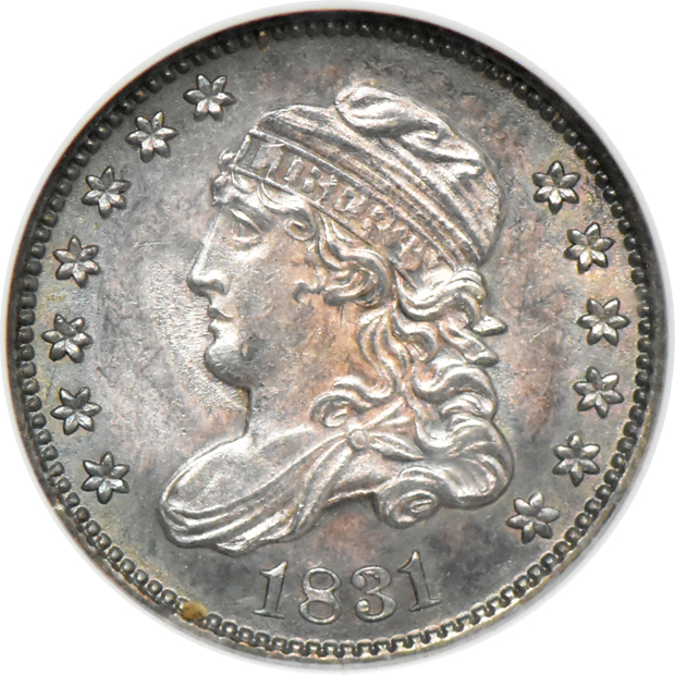 Description: Logan-McCloskey-6 usually has two characteristics that make it a cinch to attribute this common die-marriage: a chip in the upper loop of "3" (sometimes called a repunched digit although that seems unlikely) and a filled lower loop for the second "S" of STATES. Here is a frosty and lustrous violet-pewter example that received several small nicks below the eagle's beak to determine the grade. Both sides are nicely impressed by a very good strike.