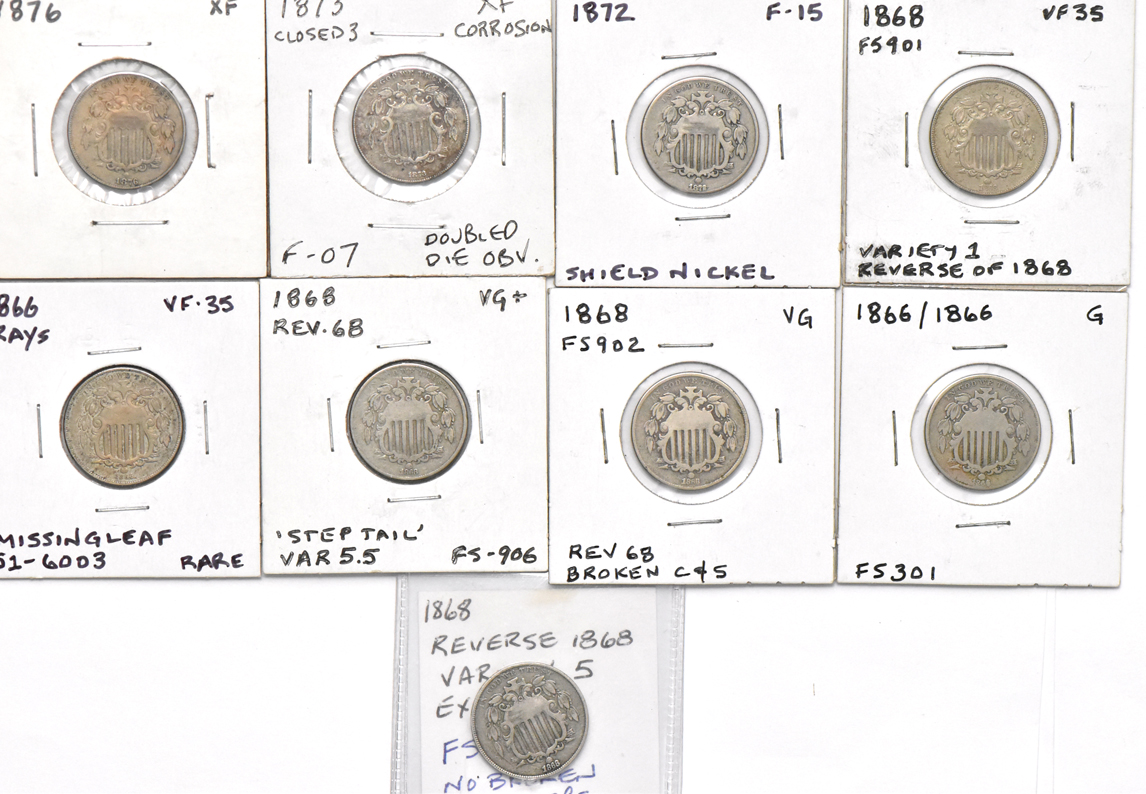 Group of nine Shield nickel varieties