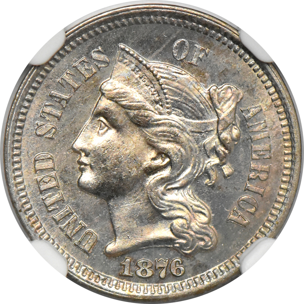 Description: The nation's centennial was not commemorated on most coinage of 1876 but one can celebrate today by reeling in this particularly well struck gem. Bone-white overall, the fields display subtle pastel hues at some lighting angles, and no abrasions malign either side.